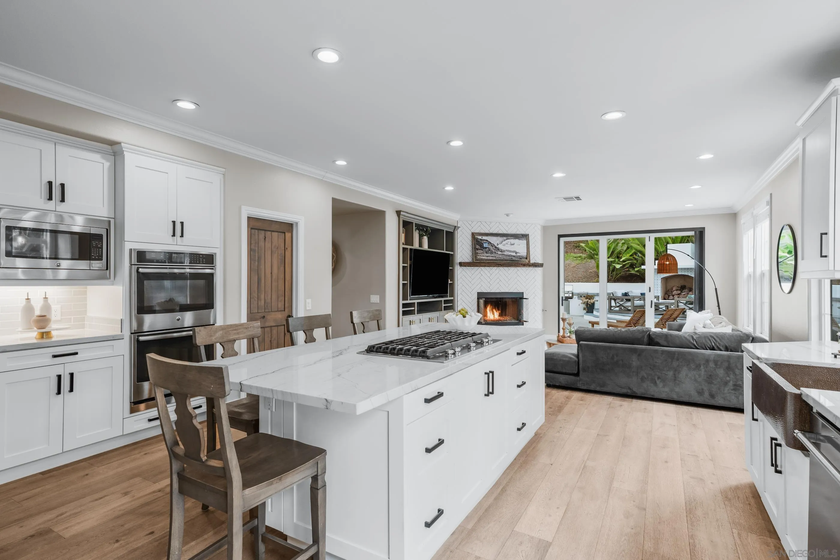 Located in the highly sought after Saltaire neighborhood of Carlsbad, this stunning 5 BR home offers luxury, comfort, and a spectacular location! Remodeled inside and out! Featuring a gourmet kitchen with premium appliances and a gorgeous yard including a stunning pool with elegant waterfall, jacuzzi, barbeque, fireplace and lush landscaping. Control the mood of your private backyard oasis with custom lighting. Perfect multi-generational floor plan with bedroom + full bath + spacious den on main floor. High ceilings, open floor plan, cantina door, built-ins, custom tile work, and wood floors throughout. Light and bright! Peaceful, private, and located on a quiet cul-de-sac street. Buyers will love the low HOAs, A/C, whole house water softener, owned solar, exterior shower with hot water and three garaged spaces. Just over a mile to the beach and a five-minute drive to Carlsbad's private airport. Walk to Poinsettia Park, Legoland, and award-winning schools such as Pacific Rim Elementary, Aviara Oaks Middle, Carlsbad High and Sage Creek High. Entertainment, golf, retail, and restaurants are just around the corner!
