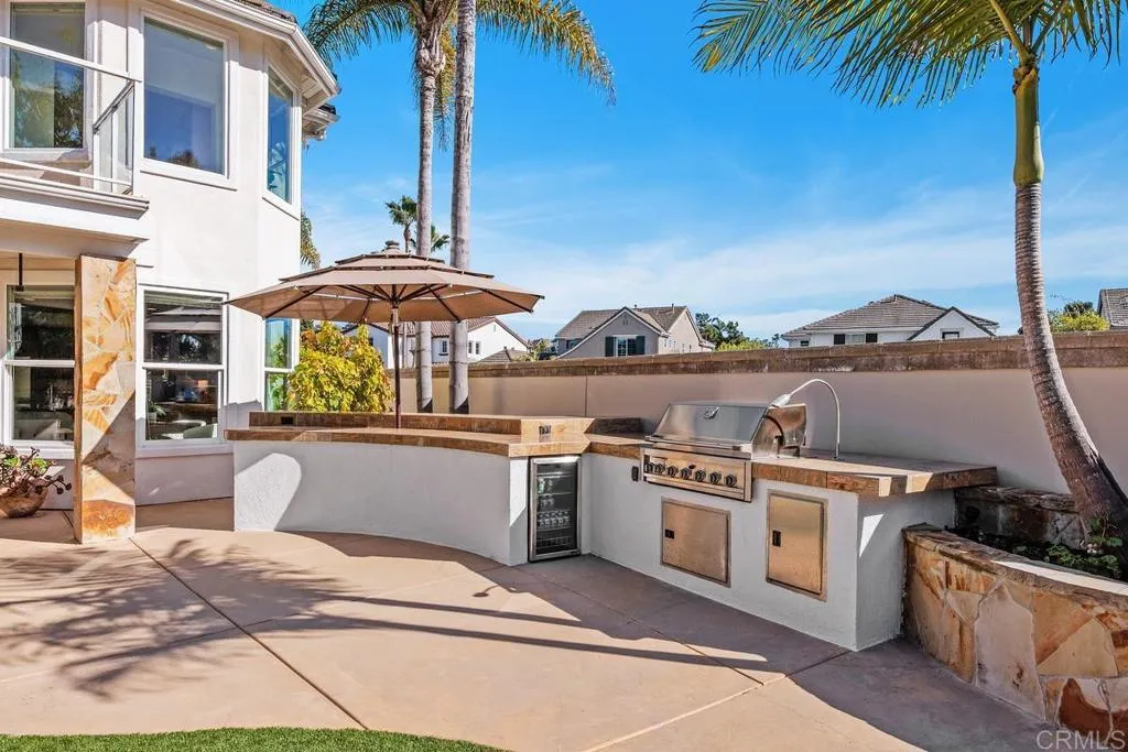 Resort-Style Living Experience with a Lushly landscaped Oasis entertainment design: Outdoor covered patio with recessed lighting, pre-wired for cable and speakers. Salt Water Pool/Spa (solar) and outdoor built in BBQ with enormous granite top outdoor island, includes beverage refrigerator. Custom built stand alone outdoor Fireplace (gas). Artificial grass in back yard. Cul-de-sac location. Main Floor downstairs has a bedroom/full bathroom ensuite and an extra large flex room which can be a bedroom/office/gym or ? Niche is ready for a closet if wanting a second bedroom downstairs. Upstairs has 3 bedrooms (one is Primary Bedroom, one is ensuite with full bathroom and a 3rd bedroom which has access to a hall way full bathroom. Additional loft with attached Office in the round could also be a bedroom. Upstairs has laundry room ready for side by side washer/dryer with built in sink. Primary Bedroom has huge cherry wood, custom organized walk in closet. Marble throughout primary bathroom with dual sinks and large roman tub and separate shower. Enjoy sunsets and sunrises off of Primary Bedroom View Deck. Large Gourmet kitchen with stainless steel appliances, 5 burner stove top, cherry wood cabinets and granite counter tops with back splash. Beautiful, newly refinished walnut wood floors extend to most of the downstairs main level. Double Oven, built in Microwave and refrigerator. Garage features extra storage cabinets. Property is on large .39 acre lot! Ocean and Sunset/Sunrise Views from this stunning Standard Pacific, Bay Collection Home. Just .3 miles to Award winning Pacific R